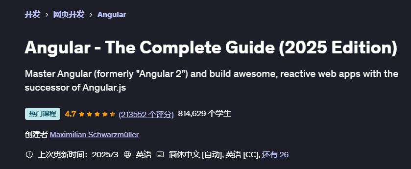 这门课程名为《Angular -The Complete Guide(2025 Edition)》,旨在帮助学员从零开始全面掌握Angular框架,构建现代、响应式的Web应用程序。
