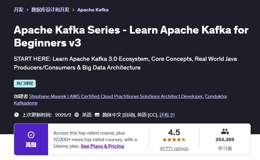 这门课程是 Apache Kafka教程,专为那些想深入了解Kafka并应用于分布式系统和实时数据流处理的开发者设计。课程内容全面,覆盖Kafka的核心概念、架构设计、生产者和消费者模型、以及Kafka的实际应用场景。通过这门课程,你将能够高效地使用Kafka构建可靠且高吞吐量的实时数据流处理系统。