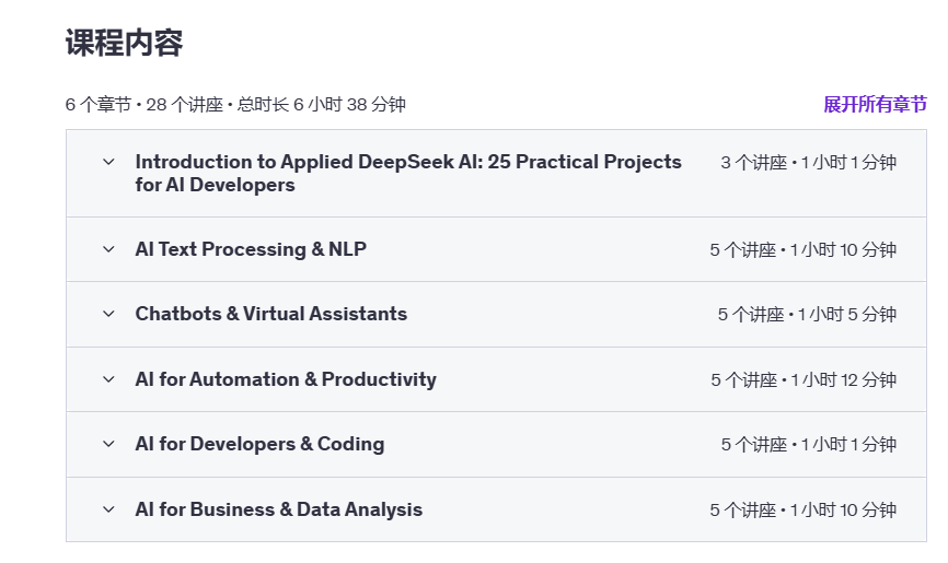 这门课程名为《DeepSeek R1 AI:初学者的25个真实世界项目》,旨在为人工智能初学者提供实践经验,帮助他们通过构建25个真实世界的项目来掌握AI开发技能。