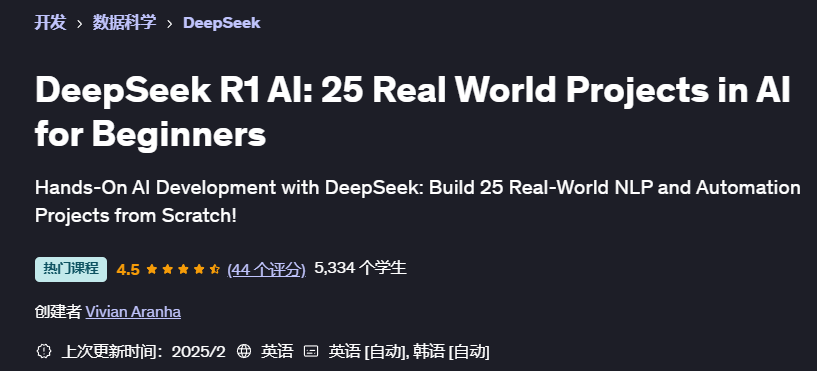 这门课程名为《DeepSeek R1 AI:初学者的25个真实世界项目》,旨在为人工智能初学者提供实践经验,帮助他们通过构建25个真实世界的项目来掌握AI开发技能。